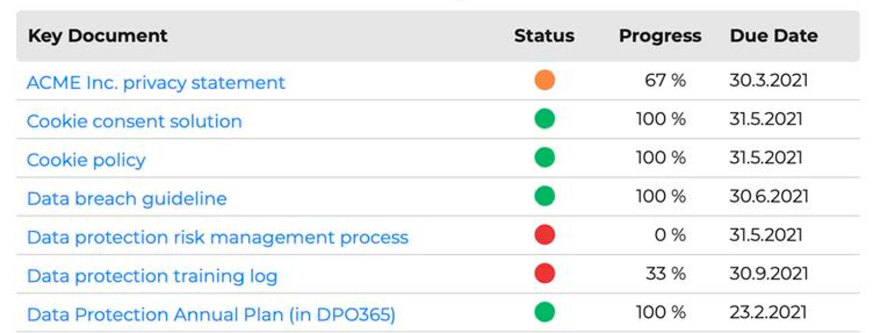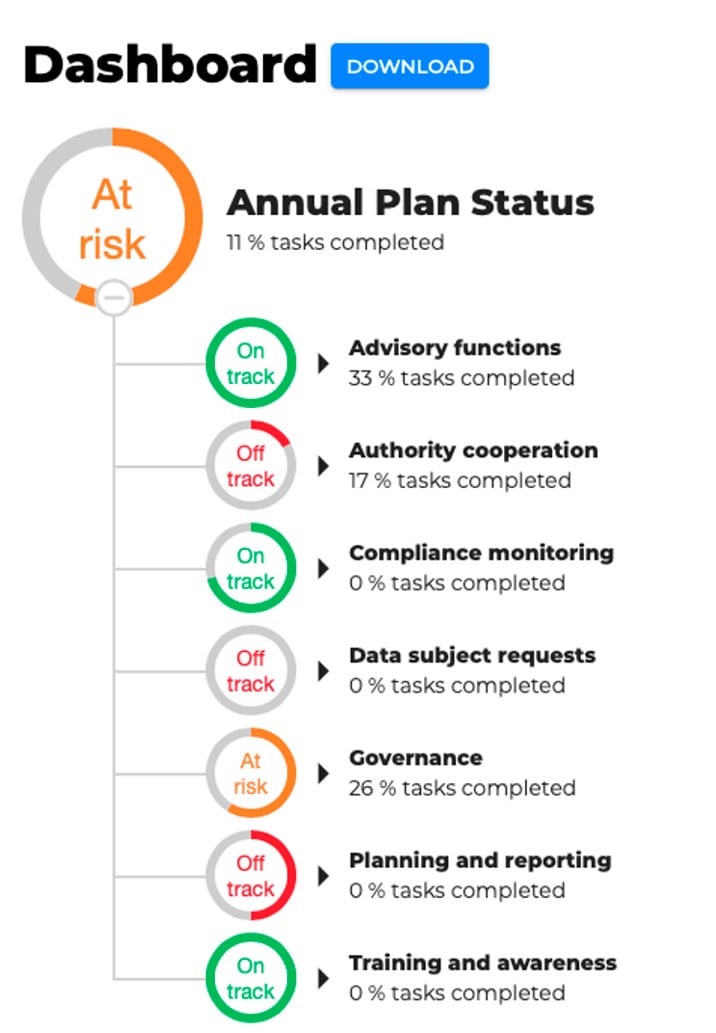 The dashboard provides answers to the question: “Are all the planned data protection tasks on track in our organisation?” in seconds.