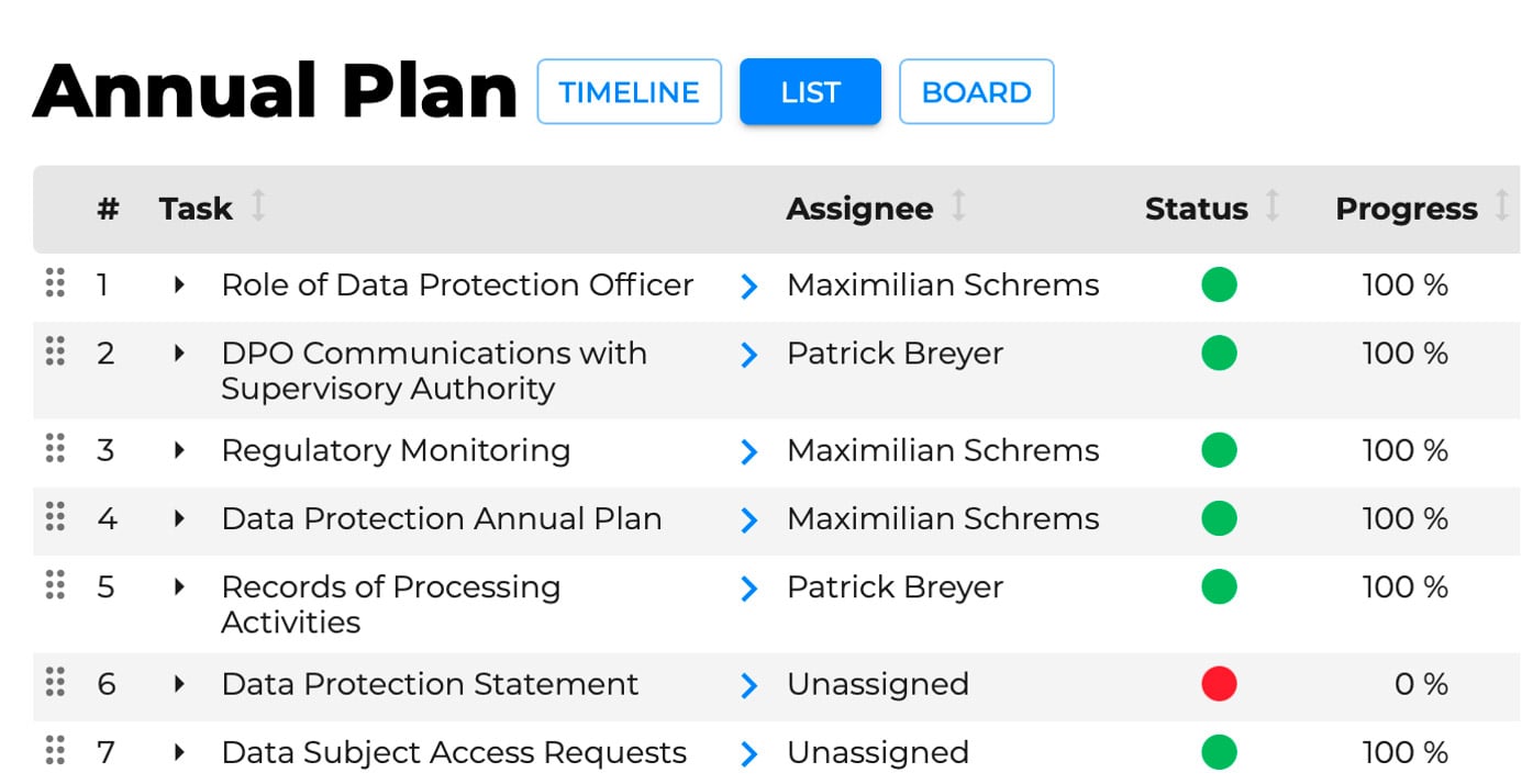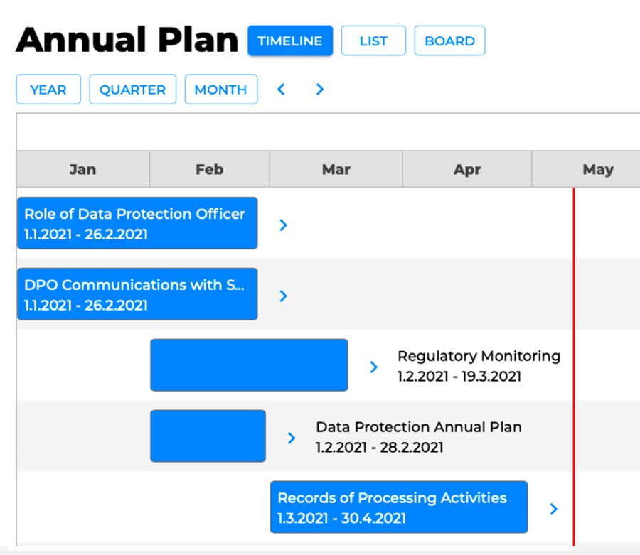 DPO can monitor the annual plan’s progress through the dashboard. With colourful dashboard visualisation and a Gant-style project scheduling view, the progress of the tasks is easy to assess.